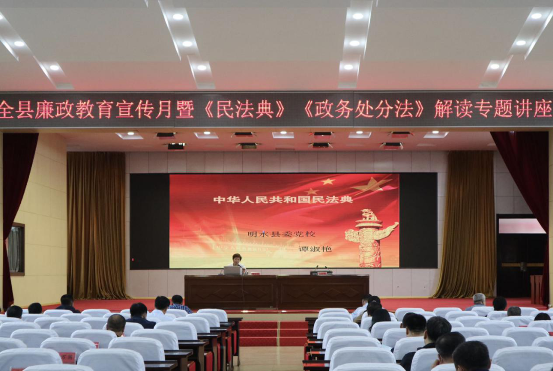 814日,明水县纪委监委为了深入贯彻落实廉政教育宣传月活动,加大党员干部对《民法典》、《政务处分法》的深入理解和认识,特意请到了两位法律专家,开展了关于《民法典》、《政务处分法》两部法律法规的专题知识讲座。